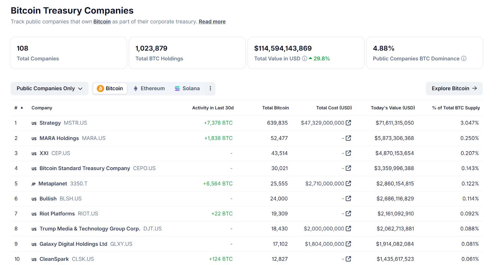比特币是DAT最先崛起的领域。Strategy在2020年的豪赌奠定了BTC财库的先河,其后众多公司加入“囤比特币”的行列。根据CoinGecko最新数据,目前共有108个上市公司持有BTC,总持仓量超过100万枚,占BTC总供应量的4.88%。