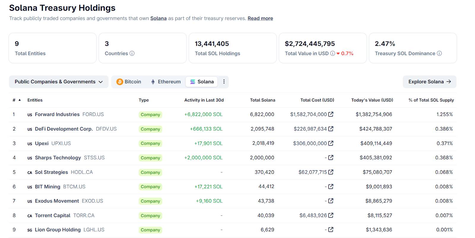 今年下半年,Solana成为DAT领域的焦点。继BTC和ETH之后,SOL正加速迈入机构采用快车道:目前已有9家上市公司对SOL押注,总金额高达27亿美元,总持仓量超过27亿枚,占SOL总供应量的2.47%。