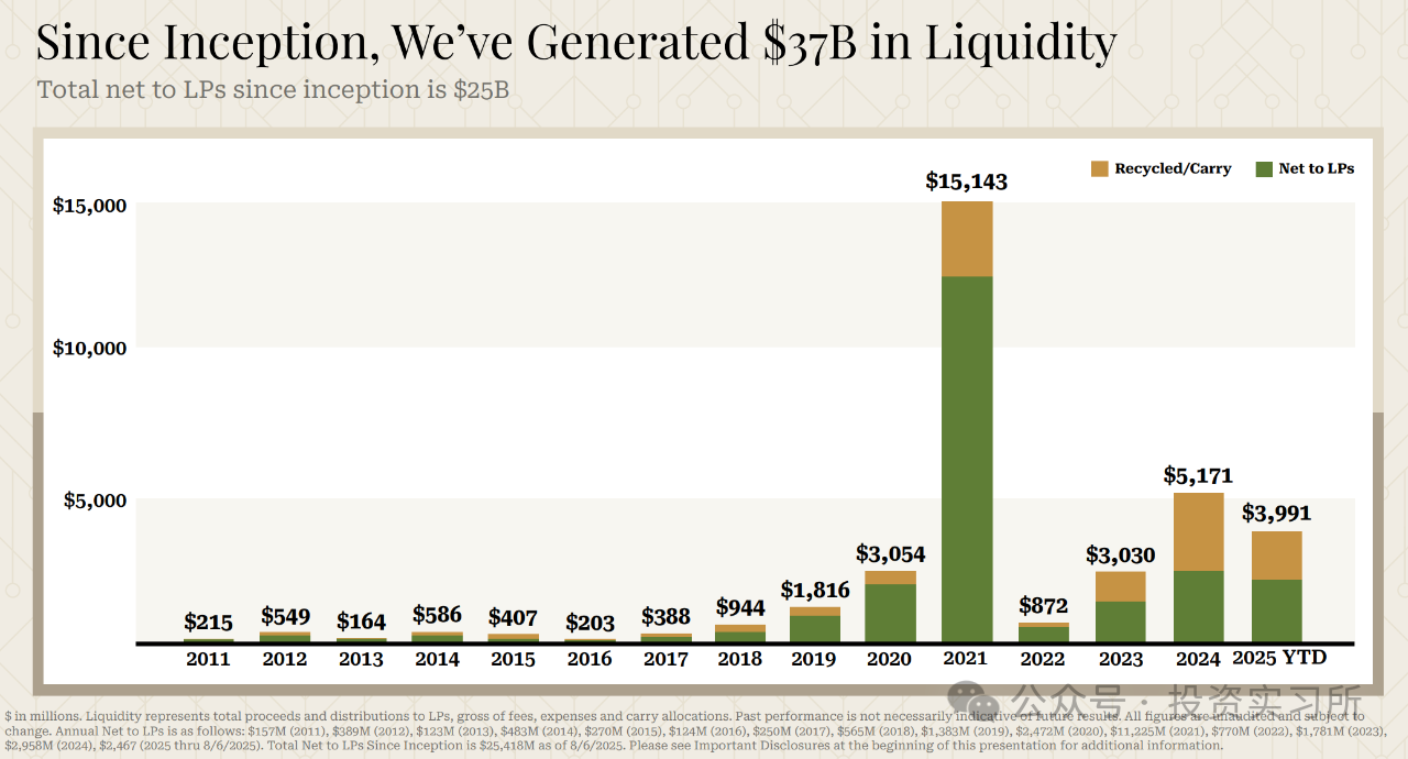 而最近一份泄露出来的 PPT 显示,自从 2009 年成立以来,a16z 给 LP 的净回报已经达到了 250 亿美金,其中 2021 年就有 112 亿美金。2021 年是 SaaS那一波的最高点,没想到 a16z 成为了那波泡沫的最大赢家。