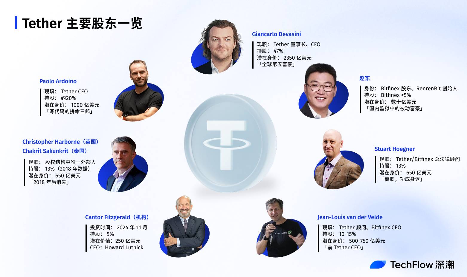 不到 10 个人掌控着 Tethter 1,700 亿美元稳定币帝国的绝大部分股权。其中,仅 Giancarlo Devasini 一人就持有 47%;而剩下的大人物们,甚至大多数都不在加密行业的聚光灯下。