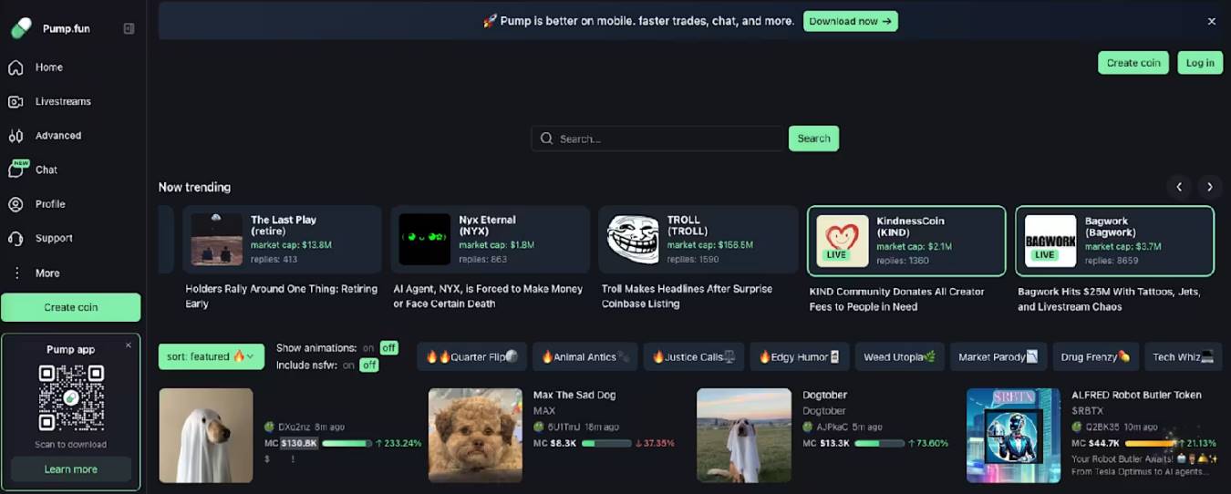 Pump.fun 主页,堪称「激进投机者」文化的典型代表