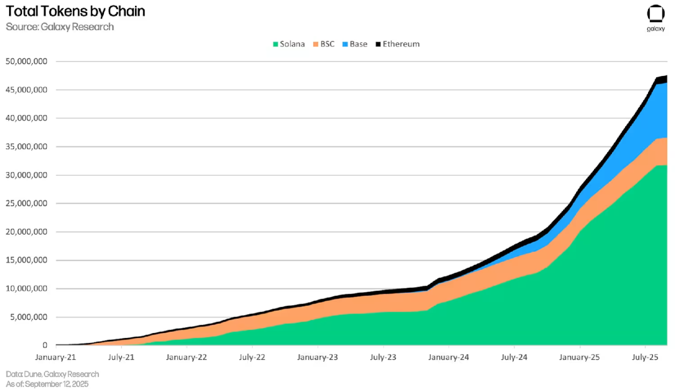 Pump.fun 彻底改变了行业格局。它首次将发行 Meme 币的门槛降至几乎为零:只需几美元,无需任何编程技能,任何人都能创建一种可即时交易、具备流动性且基于「绑定曲线」发行的代币。这标志着 Meme 币领域发生了结构性转变 —— 代币发行量激增,而发行平台也成为了「新的主流模式」。