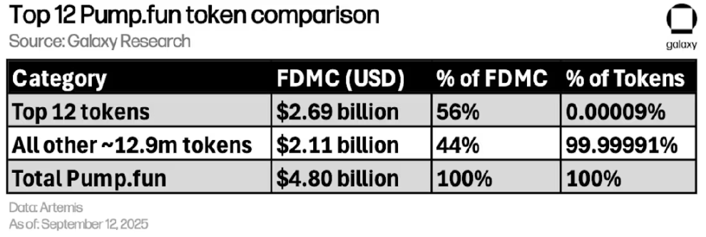 在 Pump.fun 平台发行的约 1280 万种代币中,仅 12 种代币(占比 0.00009%)就占据了该平台总完全稀释市值(FDMC)的 55% 以上。