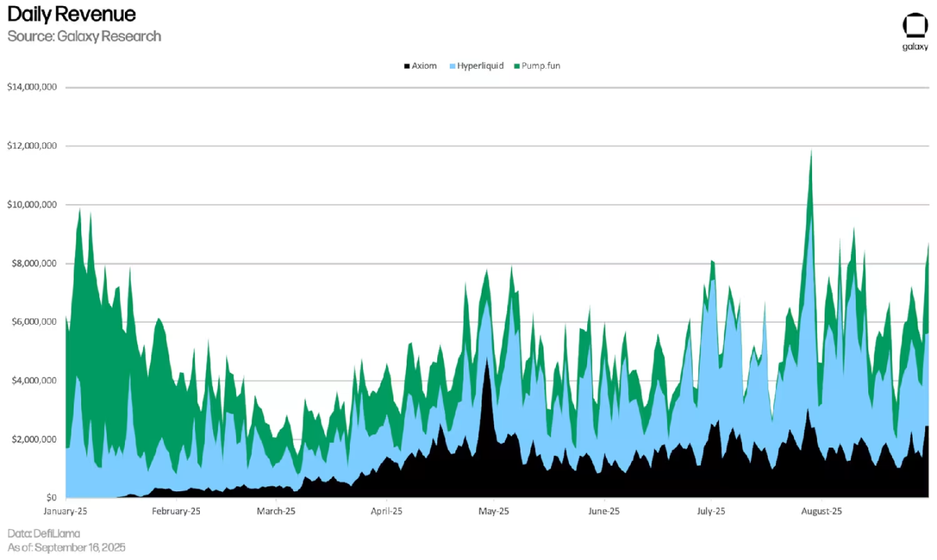 尽管多数 Meme 币交易者都在亏损,但搭建交易生态的基础设施方,却赚走了市场中的大部分价值。下图对比了 Pump.fun、Axiom 与 Hyperliquid(虽不专注于 Meme 币,但为便于对比仍纳入统计)的收入情况。值得注意的是,Axiom 团队规模极小(不足 10 人),却通过向 Meme 币交易者收取手续费,实现了每月数百万美元的收入规模。