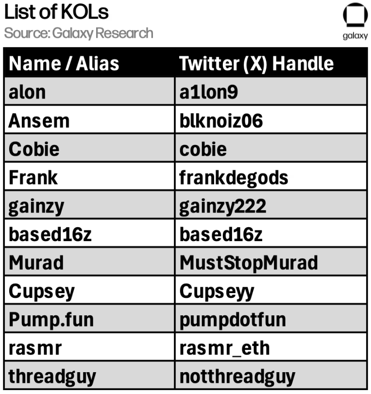 由于 KOLs 在「捧红」或「扼杀」Meme 币方面影响力巨大,以下列出了一批在 X 平台上推动 Meme 币叙事的核心活跃账号(非详尽列表):