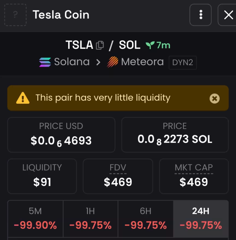 流动性被撤回后,Dexscreener 上的交易对显示:基本无法交易(注:该代币与特斯拉无任何关联)