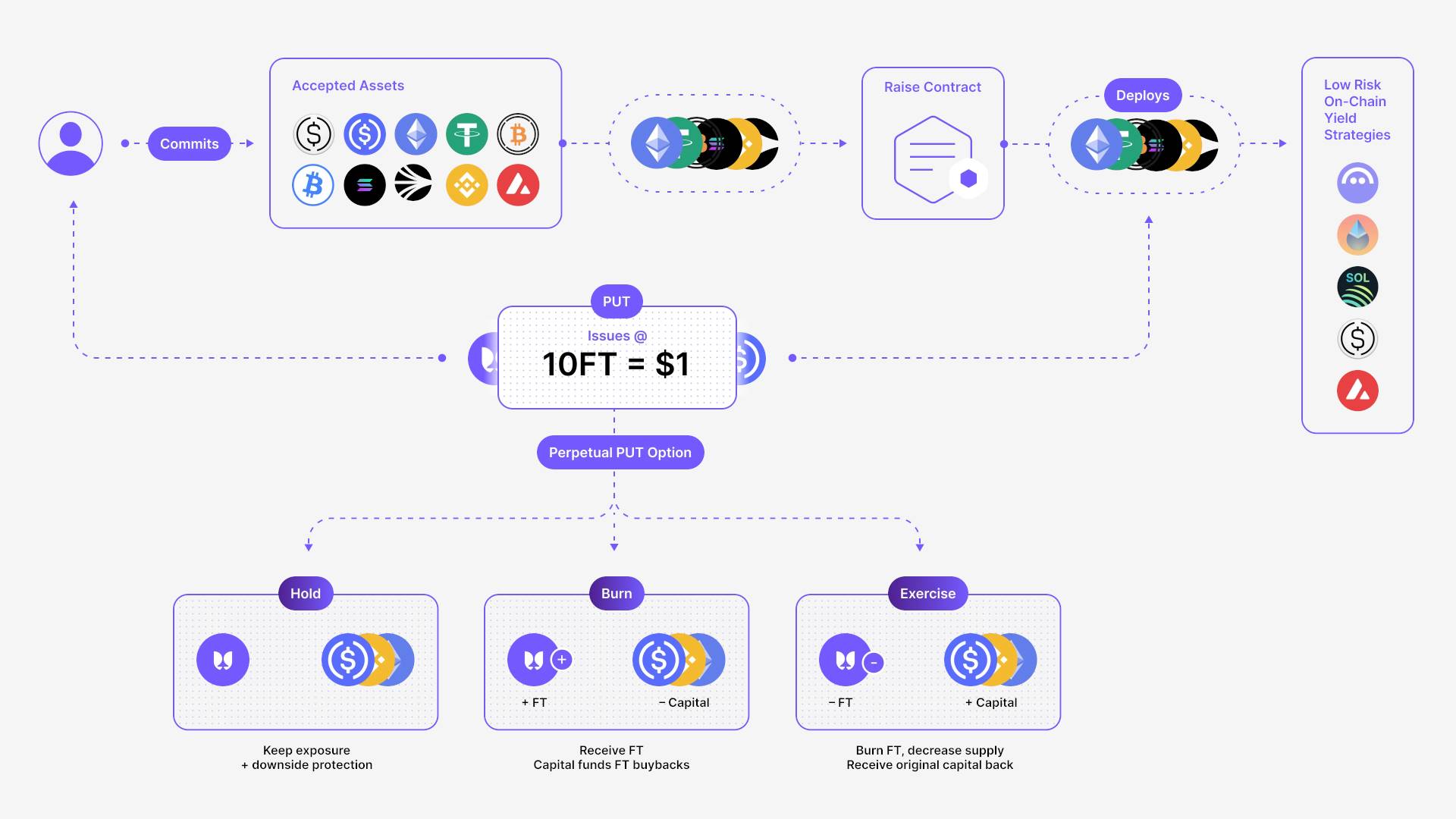 在关于 Flying Tulip 的融资公告中,最引人注目的内容除了「10 亿美元」的巨额融资目标外,莫过于 Flying Tulip 将采用一种与传统私募或公募截然不同的募资方式 —— 具体而言,Flying Tulip 将通过永久看跌期权为所有投资者提供可逆的「赎回」选项,允许投资者在任何时间销毁代币 FT,并按投入资产(如 ETH)赎回本金。