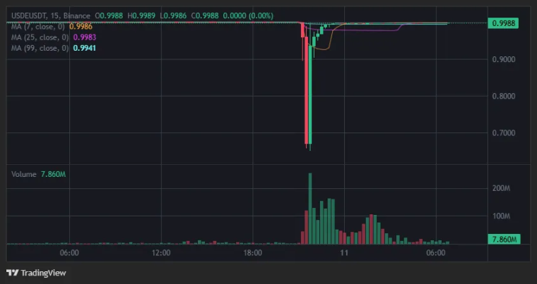 我看到很多关于 Ethena 在这个周末市场混乱期间脱锚的讨论。情况是 USDe(Ethena 发行的稳定币)曾短暂脱锚至约 0.68 美元,随后有所回升。这是大家都在引用的币安图表: