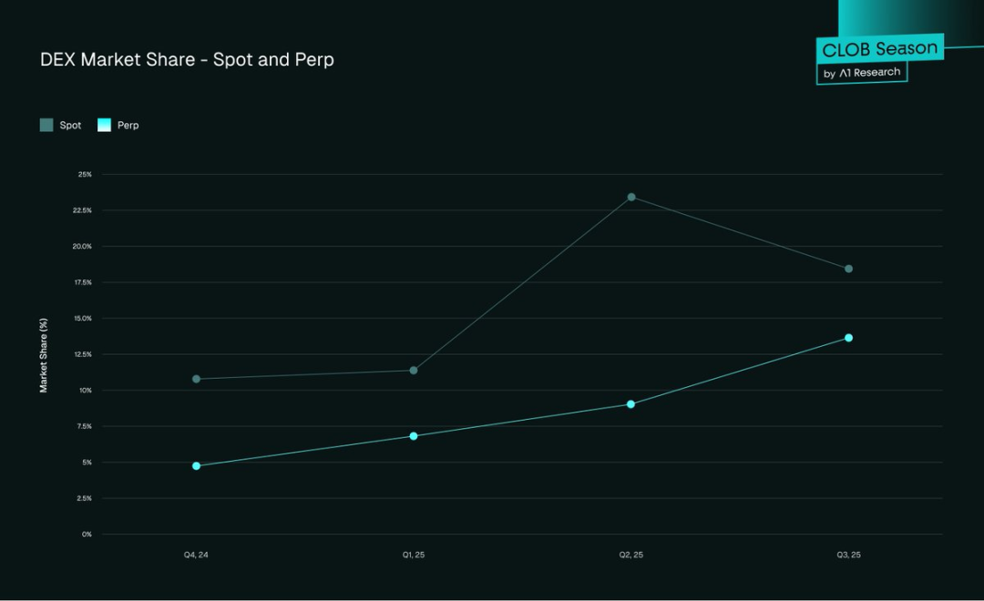流动性转型:AMM 逐步被链上 CLOB 取代,实现深度订单簿、窄点差与低滑点;