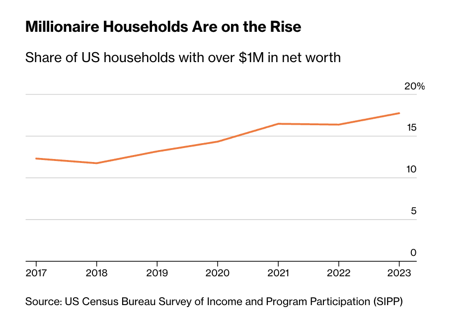 如今,根据彭博社对截至2023年的政府调查数据进行的分析,美国的百万富翁家庭数量已超过2400万,占美国家庭总数的近五分之一。