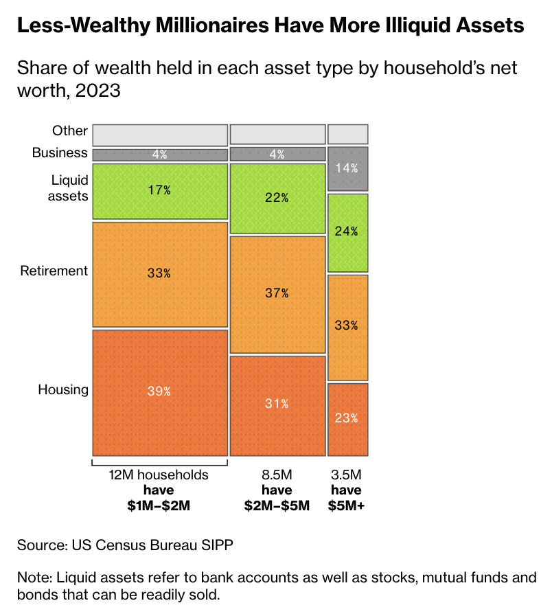 百万富翁家庭数量正在增加,但他们的大部分财富却被困在难以快速变现的资产中。