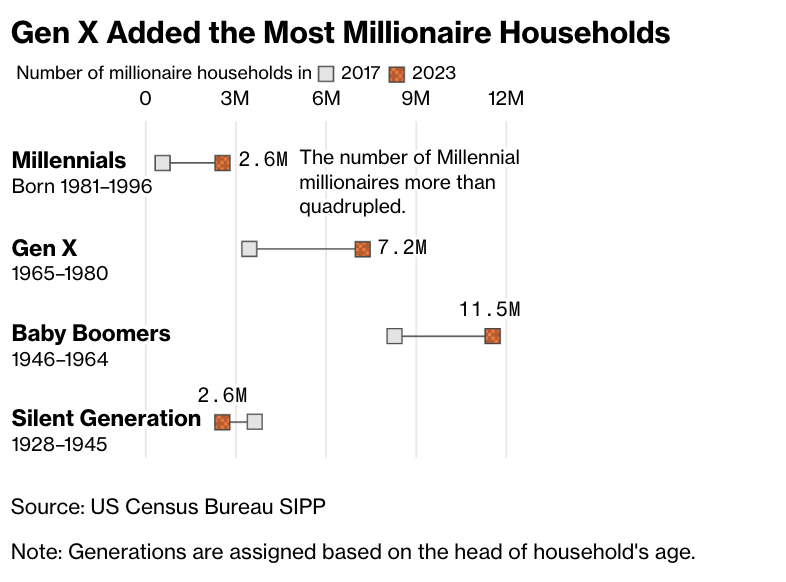 不同世代百万富翁的数量以及他们的财富分布存在显著差异。随着“沉默的一代”(Silent Generation)逐渐离世,唯一呈现数量下降趋势的是1946年前出生的百万富翁。同时,年长的美国人有更多时间积累401(k)或IRA退休储蓄账户,并可以在60岁生日的六个月前开始自由提取这些资金。根据彭博社的分析,千禧一代百万富翁的财富中只有约27%存放在退休账户中,而婴儿潮一代(Baby Boomers)的这一比例则达到了37%。