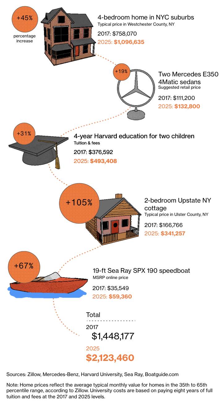 以纽约一个富裕家庭的生活方式为例:一套四居室住宅、两辆全新梅赛德斯轿车、两个孩子的常春藤盟校教育、一处北部小型度假屋以及一艘19英尺的快艇。不到十年前,这些支出总计约140万美元。而到了2023年,同样的生活方式成本已经攀升至210万美元。