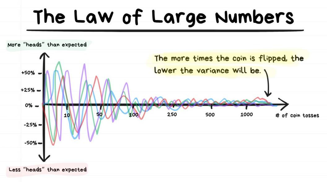 如果抛 10,000 次硬币,结果可能是 5050 次正面、4950 次反面,尽管正面次数比预期多 50 次,但从百分比来看,方差仅为 0.5%(50÷10000)。