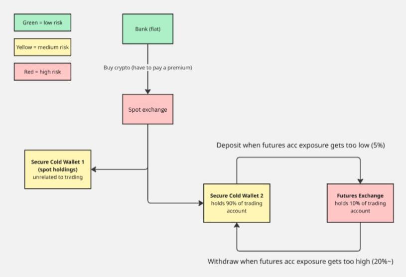 补充说明:下图是我管理交易所存取款的流程图,核心原则是 「不将所有资金集中在单一交易所,避免过度暴露风险」。