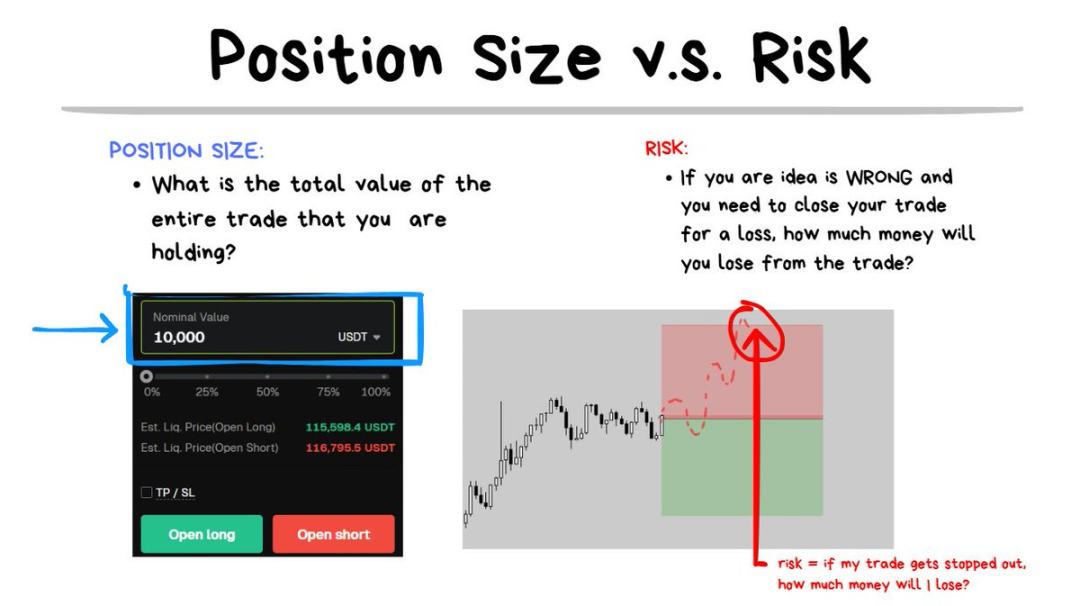 头寸规模是 你买入 / 卖出的代币价值,而风险是 判断错误时将亏损的资金金额;