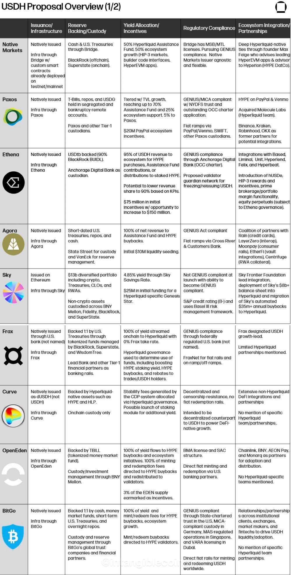 USDH 收到了来自多家知名机构玩家的多个提案,包括 Paxos/PayPal、Agora、Ethena、BitGo 和 Native Markets。这些提案详细说明了各自的托管机构、国库券收益分配、与新通过的 GENIUS 法案的合规性以及拟议的合作伙伴关系。其中,Native Markets 的提案已通过 Hyperliquid 的治理机制。
