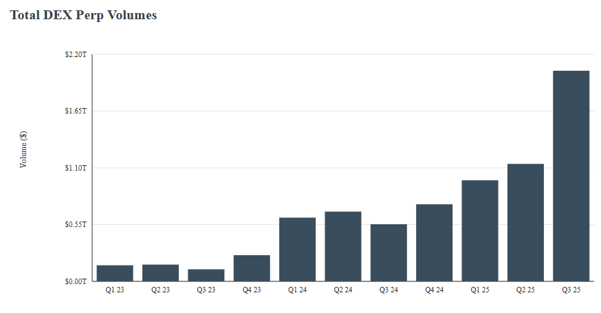 从 2025 年永续交易量的季度环比增长来看,Hyperliquid 在 2025 年第一季度增长了 110.72%,第二季度增长了 16.27%,第三季度增长了 52.25%。