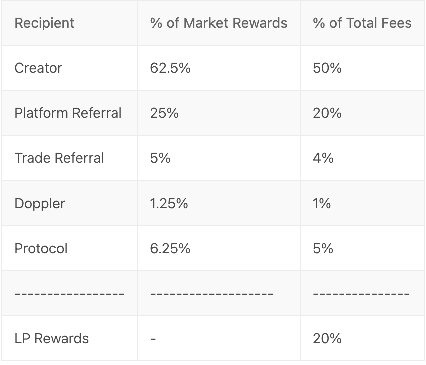 更核心的创新在Zora的收益分配模型设计上,Zora平台上的代币交易费从早期的3%下降至1%,其中50%直接支付给创作者,20%作为代币永久流动锁定,永久增加交易池子深度,20%奖励给推荐创作者部署代币的开发者/平台,4%作为特定交易地址奖励,5%进入平台国库。