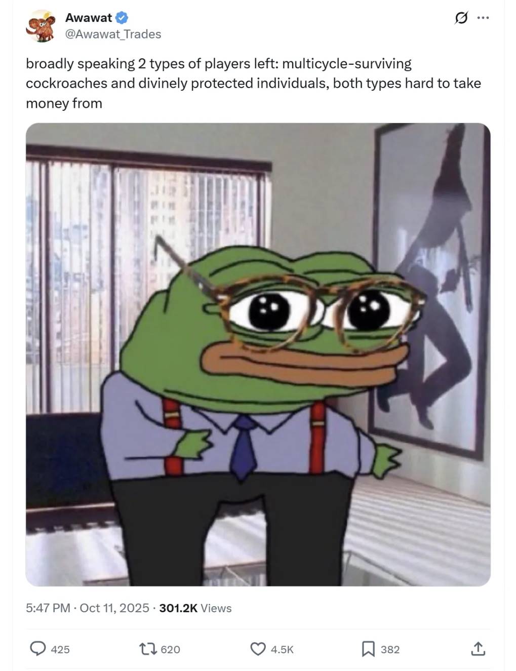 受冲击最严重的是永续合约交易者;颇具讽刺意味的是,许多「山寨币死忠」(如 Solana 领域的交易者)反而处境相对较好 —— 因为他们大多进行无杠杆交易。当然,其中也有部分人涉足了永续合约市场,若真是如此,他们大概率已损失惨重。但多数人仍坚守「现货阵地」,即便亏损,也不至于血本无归。