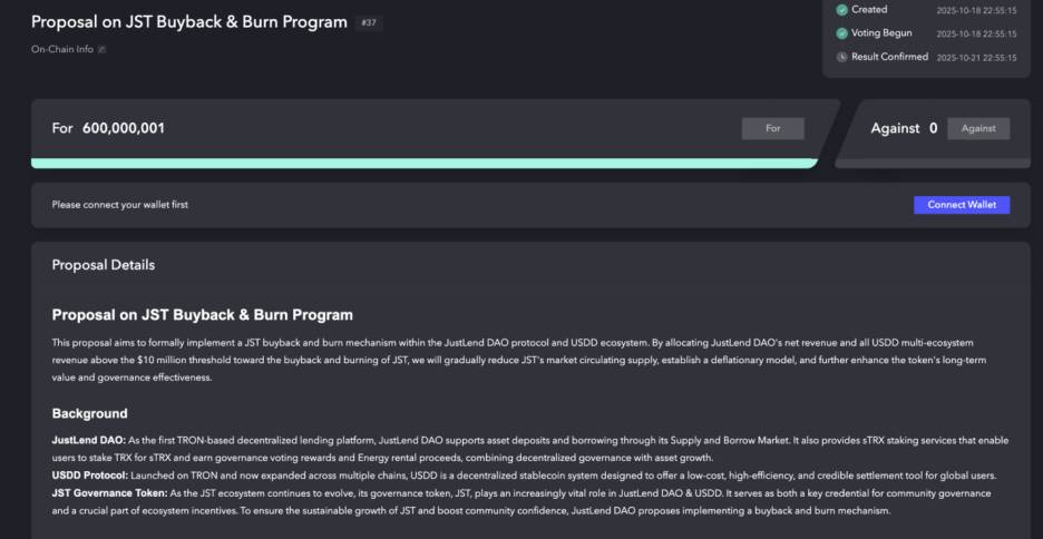在去中心化金融迈入价值回归的新阶段,一场构建可持续经济体系的深层变革正在波场TRON生态中展开。JST回购销毁提案已在JustLend DAO的DAO Governance平台正式发起,并进入社区投票阶段。