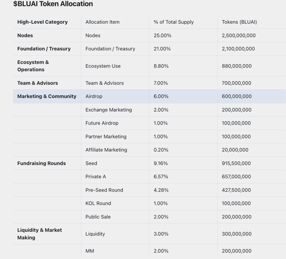 在 Web3 世界,一个项目的经济模型是其生命力的核心。其生态代币 BLUAI 的总供应量固定为 100 亿枚,在 TGE(代币生成事件)时,初始流通量为 12.28 亿枚,占总量的 12.28%。