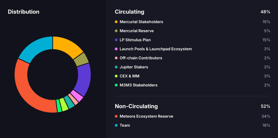 早在 2023 年,团队就宣布 20% 的 MET 代币将在 TGE 时分发给 Mercurial 利益相关者。如下所示,团队信守了最初的承诺,其中 15% 分配给 Mercurial 利益相关者,5% 分配给 Mercurial 储备。此外该 DEX 自 2024 年 1 月 31 日起一直在运行一个积分计划,总共将分配 15% 的 MET 给该计划。在启动时,MET 供应量的 48% 将处于流通状态,与 Solana 生态系统中其他著名代币发行相比,这是一个高流通比例。