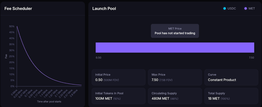 如前所述,总供应量的 10% 将用于通过动态 AMM 池引导初始流动性,起始价格为 0.5 美元,流动性分布范围直至 75 亿美元估值。早期流动性池是单边的,早期买家将用他们的 USDC 兑换 MET。请注意,池费用开始时很高,并通过费用调度程序随时间急剧下降。