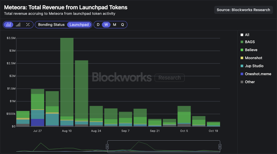 如前所述,该 DEX 与 Jupiter 团队紧密合作,Jupiter 已成为零售用户进行链上交易的常用门户。此外 Meteora 于 2024 年 8 月与 Moonshot 合作推出了一个 Launchpad,并随着时间的推移引入了新的合作伙伴,包括 Believe、BAGS 和 Jup Studio。下图显示,最近几周 Launchpad 活动为 Meteora 贡献了每周 20 万至 80 万美元的收入,其中大部分流量来自 Believe 和 BAGS。