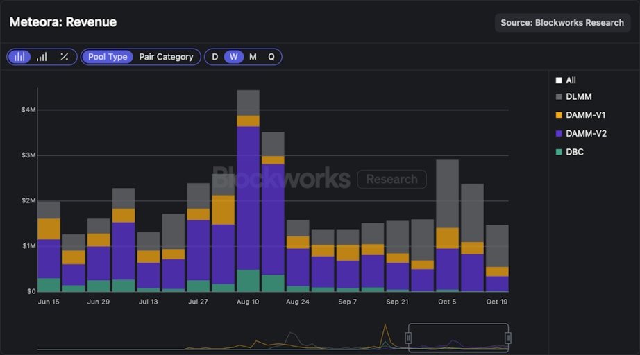 从整体财务数据来看,Meteora 在过去 30 天内从其所有资金池中产生了 880 万美元的收入,即使在链上活动相对较低的时期,每周收入也持续接近 150 万美元。值得注意的是,Meteora 超过 90% 的收入来自 Memecoin 资金池,这些池通常比 SOL- 稳定币、项目代币、LST 和稳定币 - 稳定币池具有更高的费用等级。