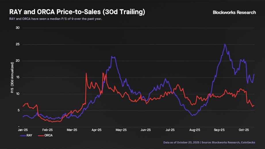 关于估值,我们可以将 Raydium 和 Orca 作为可比公司。下图显示了 RAY 和 ORCA 今年至今基于 30 日年化数据的市销率。我们观察到,直到 9 月份之前,这两种资产的定价比率相对相似,之后 RAY 开始以溢价交易。从更广的视角看,这两种资产在 2025 年的市销率中位数为 9 倍。