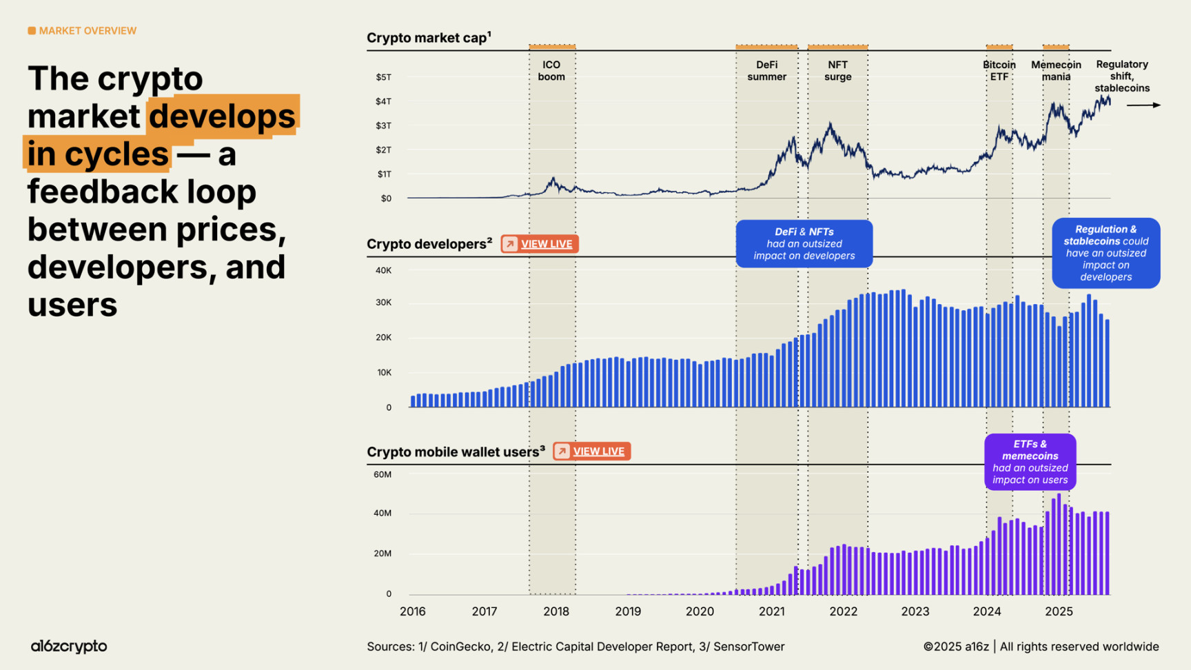 过去三年,加密行业开发者顶住市场大幅回调与监管不确定性的双重压力,持续推进基础设施升级与技术突破。这些努力让我们迎来了今天:加密货币已成为现代经济中不可忽视的重要组成部分。