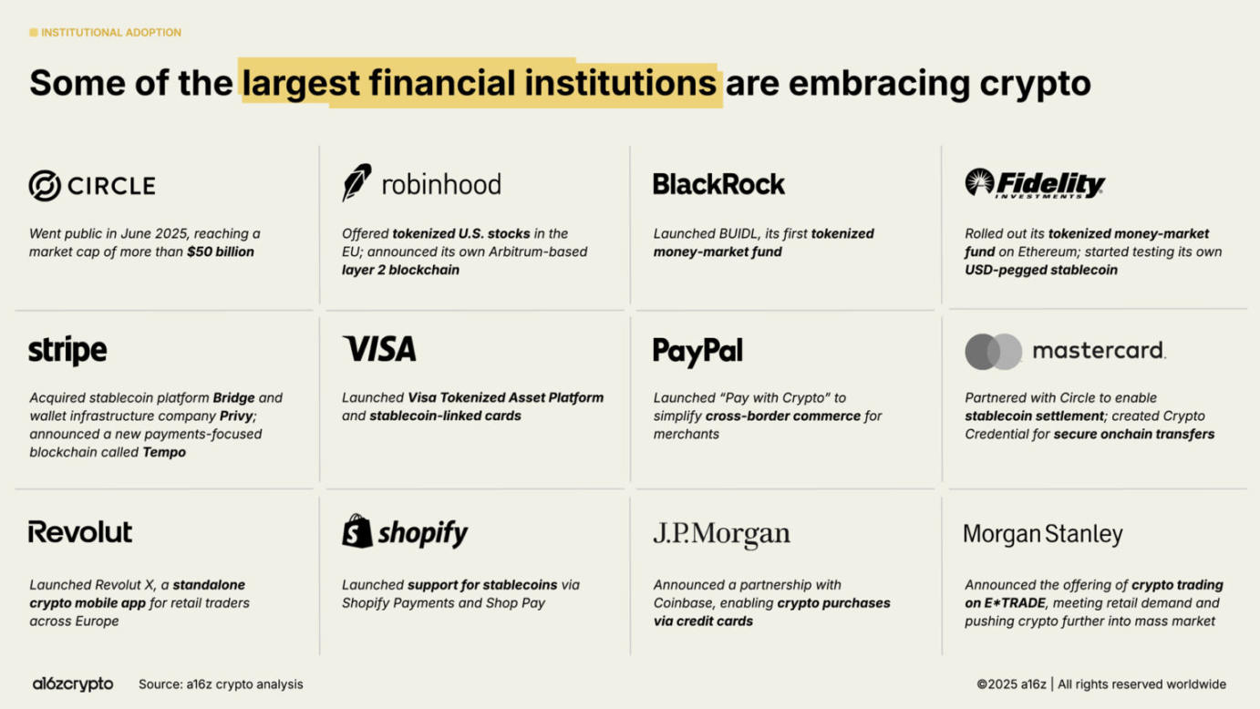 机构采用率迅速提升。包括花旗集团、富达、摩根大通、万事达卡、摩根士丹利和 Visa 在内的传统机构现在正在直接向消费者提供(或计划提供)加密产品,允许消费者买卖和持有加密资产,以及股票、交易所交易产品和其他传统工具。与此同时,PayPal 和 Shopify 等平台正在加倍投入支付业务,并为商家和客户之间的日常交易构建基础设施。