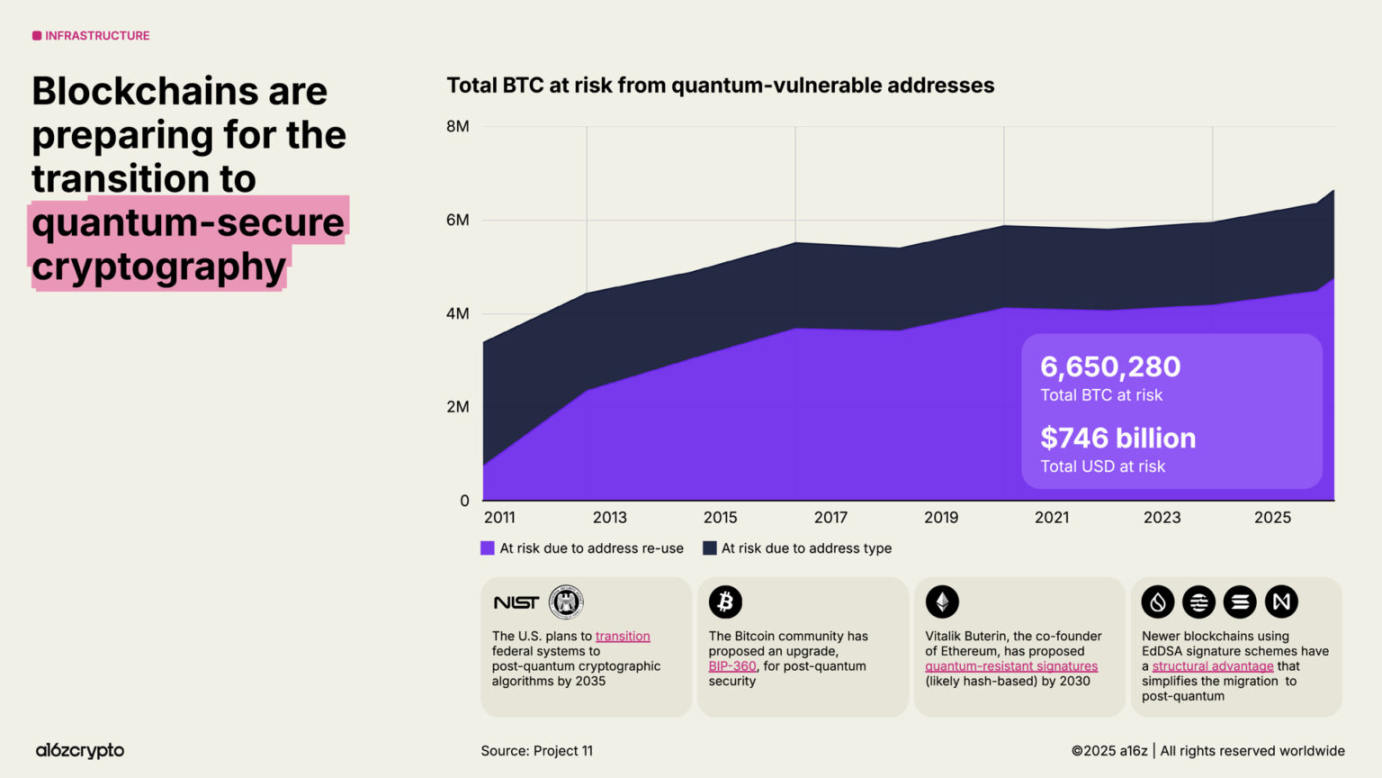 与此同时,区块链正加速推进 「后量子计算」 准备工作。目前,约 7500 亿美元的比特币存储在易受未来量子攻击的地址中;美国政府计划在 2035 年前,将联邦系统迁移至后量子加密算法。