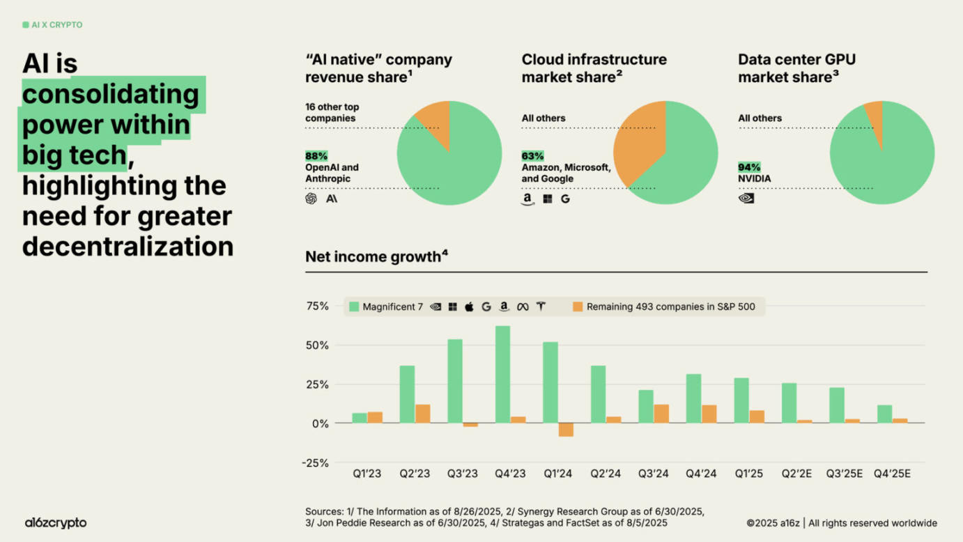 当前,AI 的计算层正逐渐向少数科技巨头集中,引发 「中心化」 与 「审查风险」 担忧。OpenAI 和 Anthropic 两家公司控制着「人工智能原生」公司 88% 的收入。亚马逊、微软和谷歌控制着 63% 的云基础设施市场,而英伟达则占据了 94% 的数据中心 GPU 市场。这些失衡推动了「七巨头」在过去几年中实现了两位数的季度净收入增长,而标普其余 493 家公司的整体盈利增长却未能跑赢通胀。