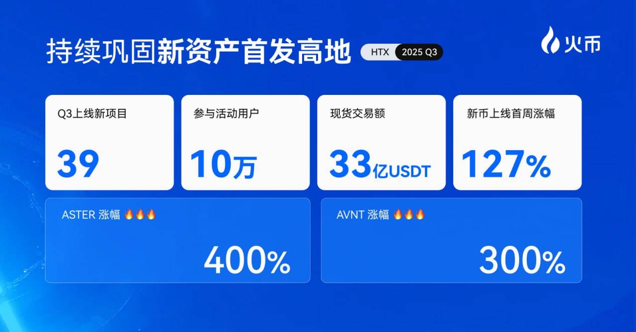 Q3季度,火币HTX共上线39个优质新项目,其中首发上线项目包括TREECAMPWLFIHOLOLINEAAVNTASTER0GXPLFF等为用户带来相当早期的投资机会,AVNT、ASTER、0G、XPL上线后都有接近翻倍的财富机会。其中,ASTER凭借“无MEV、低滑点”的创新机制,在上线后实现400%涨幅,成为季度涨幅最亮眼的明星资产;AVNT则实现3倍上涨,作为Base链的优质资产首发,受到大量用户追捧。WLFI(World Liberty Financial)作为特朗普家族支持的DeFi项目,拥有一定市场关注度,也成为季度热点。持续的优质资产的上线与首发,为用户提供了丰富的交易与投资机会,更巩固了火币HTX作为“新资产首发高地”的市场地位。