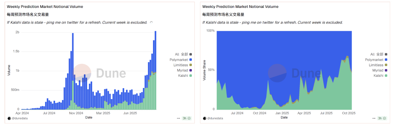 来自 Dune 平台的数据,直观地印证了这一趋势。 链上资料显示,当前的加密预测市场已呈现出高度垄断的「双寡头」格局:Polymarket 与 Kalshi 两家巨头瓜分了 95% 以上的市场份额。而在资本与监管的双重利好刺激下,这个赛道正被整体激活。10 月中旬,预测市场的单周交易总额突破 20 亿美元,一举超过了 2024 年美国大选之前的历史峰值。在这轮爆发式增长中,Polymarket 凭借其监管上的关键突破和潜在的代币预期,暂时在与 Kalshi 的激烈竞争中略占优势,进一步巩固了其头部地位。