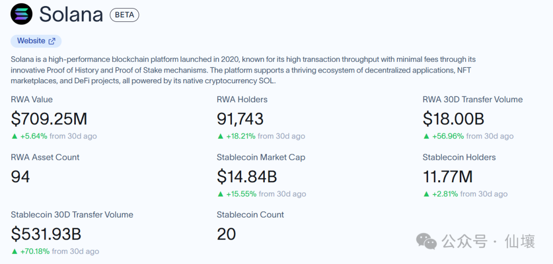 从数据来看,Solana 的 RWA 生态虽然处于早期,但已表现出强劲的增长势头,根据 RWA.xyz,当前 Solana 生态内 RWA 资产已达 94 种,总市值达 7 亿美元。而最近 30 天,Sol 链上的 RWA 转账金额达到 180 亿美元,交易量仅次于以太坊。