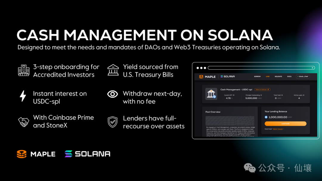 2023 年 5 月,Maple 推出了资管方案 Maple Cash Management Pool,靠国债收益为用户提供 4.8% 左右的净 APY,可以根据需要自由进出池,而无需支付锁仓或赎回费,成为 Solana 生态首个国债类 RWA。现在产品已被拓展为 USDC 借贷,但考虑到其在 Solana 生态的开创性作用, 也记录在本文中。