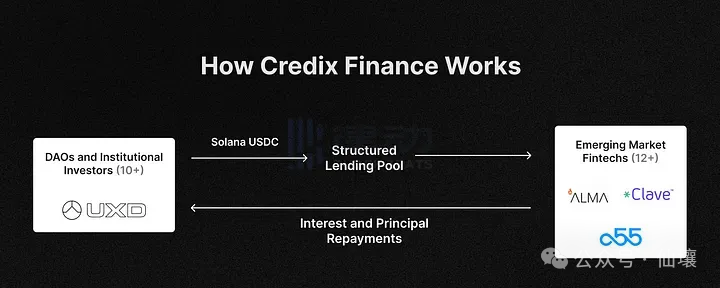 Credix Finance 于 2021 年创立,专注于私人信贷类 RWA 。Credix 的逻辑比较简单,可视为一个链上与现实之间的借贷中介平台:向链上用户借来 USDC,再转换为各国本地货币,贷给各种类型的借款实体,并向链上用户提供借贷收益。