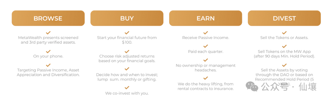 MetaWealth 与第三方质量评估机构完成审计和调研后,将合格房产收购并出租,同时将将房产的所有权碎片化,使得用户可以以最低 100 美元的低门槛参与投资,并根据投资占房产总价的份额分取租金。