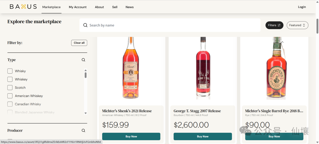 BAXUS 将高端酒(如稀有威士忌、葡萄酒)存储在安全的温控库中,每瓶酒通过区块链技术生成一个独特的 NFT,作为数字化所有权证书,记录瓶子的来源、认证和交易历史。同时提供一个类似 Opensea 的市场,允许用户直接交易稀有酒类,支持 USDC 和信用卡等传统支付方式。