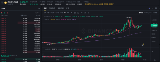 4 月,赵长鹏正式向特朗普政府提交了总统特赦申请。转折的信号在 9 月份到来,CZ 将 X 账号上的简介由「ex-@binance」 改成了「@binance」,市场对其回归猜测不断。资本们更是春江春暖鸭先知,10 月 22 日,美国本土合规交易平台 Coinbase 与 Robinhood 陆续放开 BNB 交易,主流金融不再谈币安色变,BNB 也顺利登陆至美国金融市场。