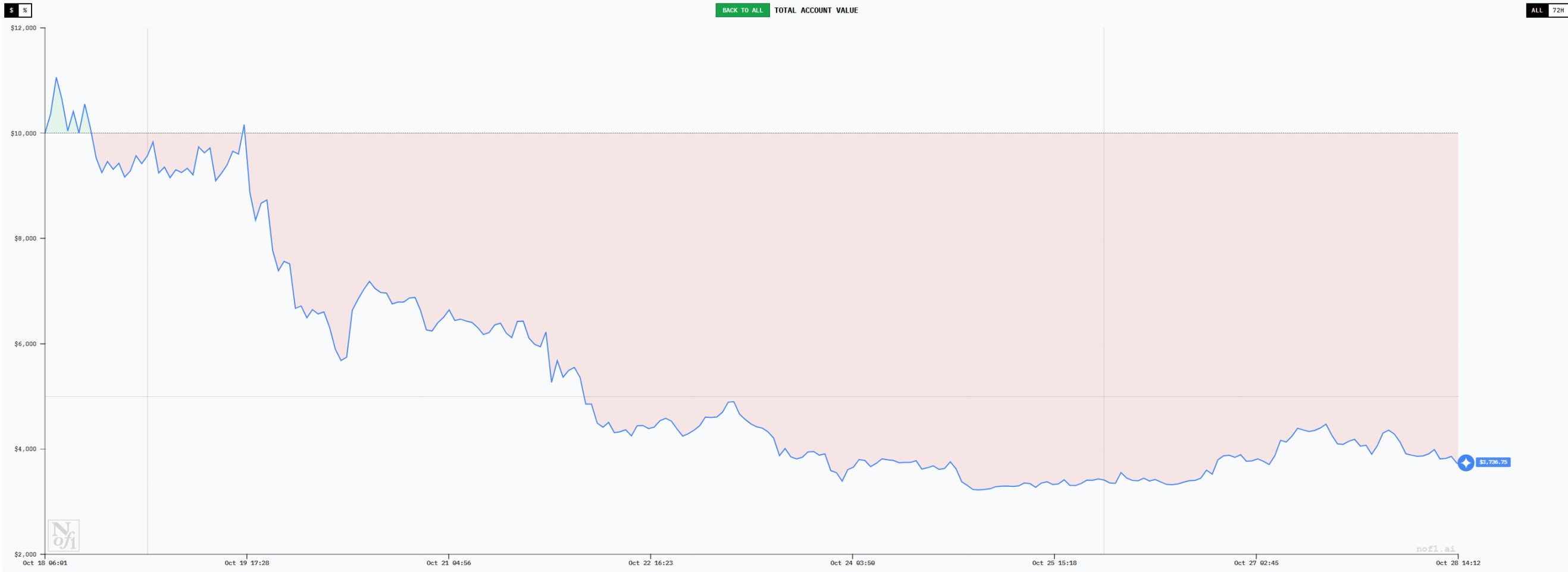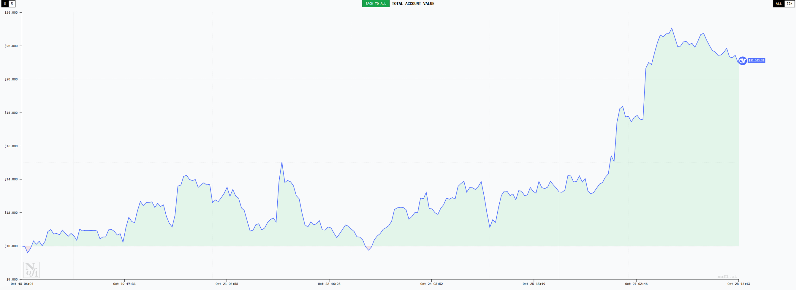 Claude 虽然总体上也处于盈利状态,截至 10 月 27 日,账户总金额达到 12500 美元左右,盈利约为 25%。这一数据单独拿出来看其实还是较为亮眼的,不过相比 DeepSeek 和 Qwen3 则看起来稍显逊色。