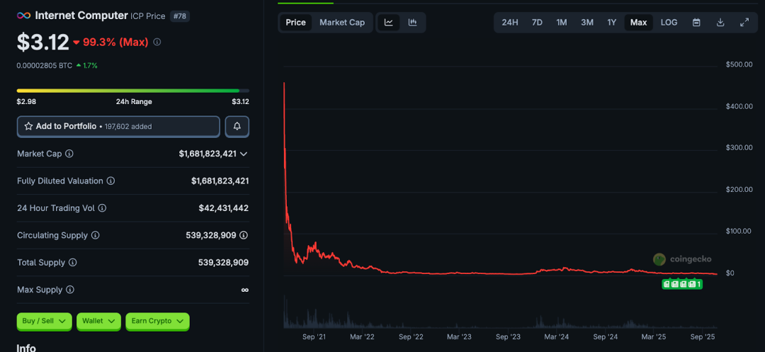 ICP 背后聚集了顶级硅谷风投,包括 a16z、Polychain Capital、Multicoin、CoinFund 等,累计融资达 1.87 亿美元。ICP 初始价格高达数百美元,峰值一度接近 700 美元,但在上线后迅速回落,两个月内跌破 20 美元。截至 2025 年,ICP 长期徘徊在 3 美元左右,较高点下跌超 99%。