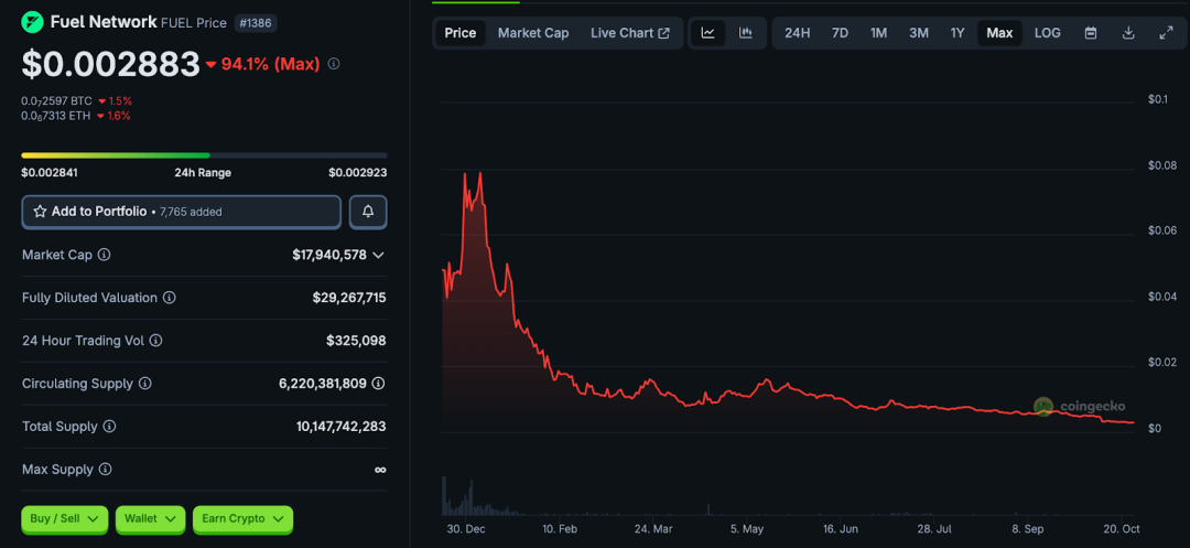 然而,在代币表现与生态落地上,Fuel Network 并未兑现预期。FUEL 当前价格约为 0.003 美元,市值仅千万美元,高点下跌超 94%。以太坊扩容、各种 L2、模块化链方案层出不穷,Fuel 的差异化优势能否长期维系尚存疑问。