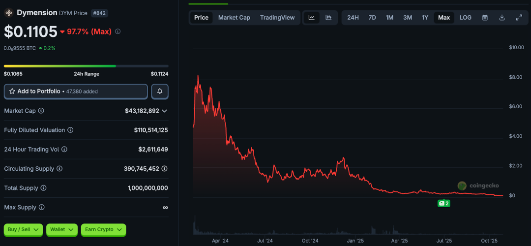 项目启动于 2022 年,2024 年年初上线代币 DYM。尽管技术定位明确、背后获得 Big Brain Holdings、Stratos、Cogitent Ventures 等多家投资机构支持,但从市场表现来看,DYM 当前价格已较峰值下跌逾 97% 以上。据数据显示,其历史高点接近约 $8.50,现价处于约 $0.10 美元区间。项目当前虽仍在运行,但生态化进展缓慢,社区与用户参与度未达到预期。