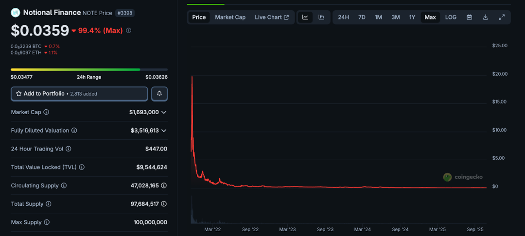 截至 2025 年,NOTE 代币市值仅剩约 166 万美元,从高点下跌超 99%,日交易量不足千元,社区活跃度和协议更新频率都较低。