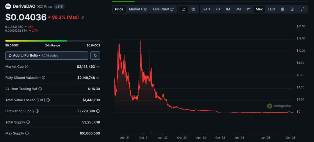 2020 年 7 月,DerivaDAO 获得 Polychain、Coinbase Ventures、Dragonfly 等头部 VC 投资,累计融资 270 万美元。虽然体量不大,但阵容被视为明星级别。2021 年上线后价格曾触及约 $15,但很快下滑。截至 2025 年,DDX 长期徘徊在 $0.01~$0.04 区间,较高点跌幅超过 99%,项目市值几近归零。