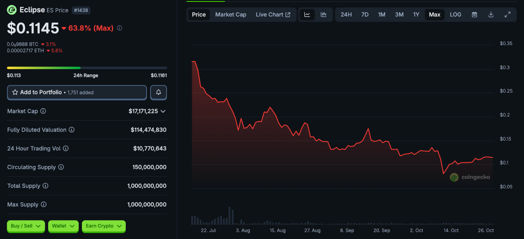 然而,从市场表现来看, ES 代币估值已经发生明显回撤。根据 CoinGecko 数据显示,ES 虽然还在交易,但较高点已大幅下跌约 64% 。 Eclipse 生态尚处于早期阶段,Roll‑up 或模块化链方案竞争激烈,多项目争夺 L2 赛道,项目市场落地的路径尚未完全显现。